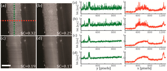In Figure 3 we evaluate the full coherent control of the illuminating light sheet and its effect on the speckle contrast, using the same test sample (FEP-tube wall) as in the previous section. The polarization configuration was set to vertical-IN horizontal-OUT, and the camera integration time was set to 500 ms. In Figure 3a a diode laser with high temporal coherence was used as an illumination source for creating a static light sheet. As seen from the figure, the speckle noise is clearly present on the obtained image. In Figure 3b we use the same laser but this time the light sheet is pivoting at 100 Hz, obtaining a reduction of the SC from 0.32 to 0.25. In Figure 3c a SCL with low temporal coherence is used to create a static illumination sheet, reducing the speckle noise down to SC = 0.19. In Figure 3d we use the same SCL light source but this time the light sheet is pivoting at 100 Hz, obtaining a further reduction of the SC from 0.19 to 0.17. Therefore, we can conclude that using a configuration that combines the use of a SCL with a pivoting approach is an effective way of reducing the SC. In our test sample, the SC was reduced by almost a half by changing from the diode-laser non-pivoting (high coherence) configuration to the SCL-pivoting (low coherence) configuration. These observations are also confirmed by comparing the line intensity cross-sections of the four configurations studied, as shown in Figure 3 (right). The intensities are plotted along the green and red dashed lines defined on Figure 3a. While the profiles corresponding to cross-sections from panels (a) and (b) exhibit strong fluctuations and discontinuities, the profiles from panels (c) and (d) are much smoother and disclose spatial information that otherwise would be hidden within the speckle noise.