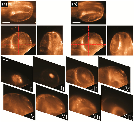 - Keller, P.J.; Schmidt, A.D.; Wittbrodt, J.; Stelzer, E.H.K. Reconstruction of zebrafish early embryonic development by scanned light sheet microscopy. Science 2008, 322, 1065–1069. [Google Scholar] [CrossRef]
