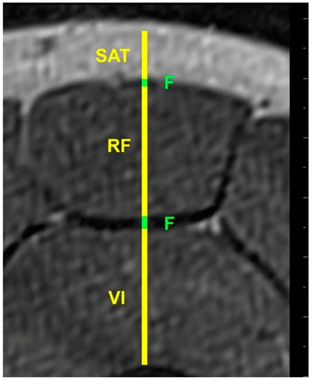 US and MRI images were anonymized and analyzed offline by the same investigator (FM), using ImageJ software (https://imagej.nih.gov/ij/). Each image was measured twice and the mean of the two used in the analysis. SAT thickness was measured from the skin to the outside edge of the superficial fascial layer, while muscle thickness of the rectus femoris (RF) and vastus intermedius (VI) was measured between the inside edges of muscle borders to exclude the perimuscular fascia. The superficial fascia was measured between its outside edges, where it lay between the SAT and superior border of the RF, while the deep fascia lay between the RF and VI (Figure 3 and Figure 4).