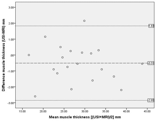 The present findings compare favorably with previous validity studies, which compared US imaging and MRI measurements for other lower limb muscles, e.g., [] reported good correlation (r = 0.87) between US imaging and MRI in linear measurements of vastus medialis distal fibres in a group of 12 healthy young adult males (aged 18–30 years). Another study also reported no significant difference (p > 0.05) in measurements of cross-sectional area (CSA) and volume of the quadriceps muscle between US imaging and MRI in a group of 10 healthy volunteers []. Mendis et al. [] reported high agreement between US imaging and MRI CSA measurements of iliopsoas, sartorius, and rectus femoris muscles with ICC values ranging from 0.81 to 0.89 in a group of nine healthy individuals (mean age: 24.3 ± 3.5 years). Similar excellent agreement was reported (ICC 0.78–0.95) for thickness of the lateral abdominal muscles (transversus abdominis and internal oblique muscles), using US imaging and MRI in healthy male athletes with a mean age of 21 (SD 2.1) years [].