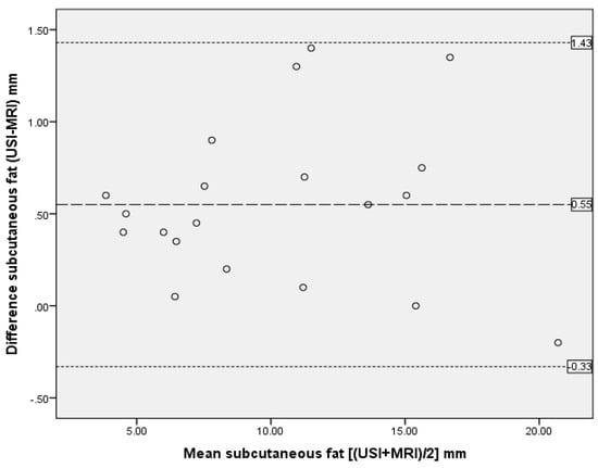 Bland and Altman plot showing difference between measurements of SAT thickness from MRI and US scan. The dashed line represents the mean difference; dotted lines are 95% upper and lower limits of agreement, representing two standard deviations.