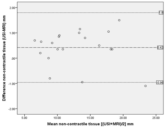 Bland and Altman plot showing difference between measurements of non-contractile tissue from MRI and US scan. The dashed line represents the mean difference; dotted lines are 95% upper and lower limits of agreement, representing two standard deviations.