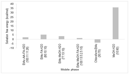 Solvation free energy of rosmarinic acid in mobile phases of fractionation.