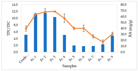 TPC/TFC ratio and rosmarinic acid (RA) content of Orthosiphon stamineus crude extract and fractions.