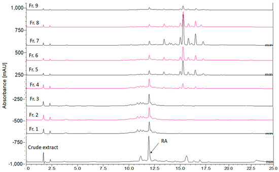 The phytochemicals profile of the crude extract and fractions were analyzed using a liquid chromatography (Ultimate 3000) system equipped with a diode array detector (Dionex, Thermo Scientific; MA, USA) and a C18 reversed phase column (2.1 × 100 mm, 2.5 µm, XSelect High Strength Silica, Waters; Milford, MA, USA). The separation was performed using a mobile phase consisted of 0.1% formic acid in water (A) and acetonitrile (B) with a gradient elution at the flow rate of 150 µL/min: 0–10 min, 10% B; 10–25 min, 10–80% B; 25–30 min, 80% B; 30–35 min, 10% B [13]. The standard solution of rosmarinic acid was prepared in a serial concentration from 0.2 to 1.0 ppm for quantitation. Compounds were detected at 254 nm. All samples were filtered with 0.22 µm nylon filter prior to injection. Duplicate experiments were performed.