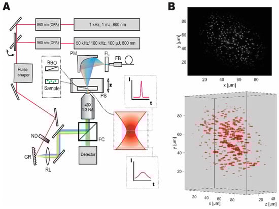Our temporal focusing microscope setup was designed and implemented based on the published reports [,,]. Figure 1 shows the schematic diagram of the setup. The first laser system, a low repetition rate, high pulse energy laser (Spitfire, Spectra-Physics, Santa Clara, CA, United States) was set to yield 140 fs, 1 mJ pulses at 1 kHz repetition rate, and 800 nm central wavelength. An optical parametric amplifier (Topas, Light Conversion, Vilnius, Lithuania) was used to obtain pulses at 960 nm wavelength (optimal wavelength for employed fluorescent probes). The second laser system, which is a high-repetition-rate source (Wyvern, KMLabs, Boulder, CO, United States), was set to either 50 kHz (for fluorescent bead experiments) or 100 kHz (for live imaging) providing 45 fs pulses with 100 µJ pulse energy at 800 nm central wavelength. A second optical parametric amplifier (TopasHR, Light Conversion, Vilnius, Lithuania) was used to convert the laser output to 960 nm central wavelength. Switching between the two laser sources was implemented with a flip mirror.