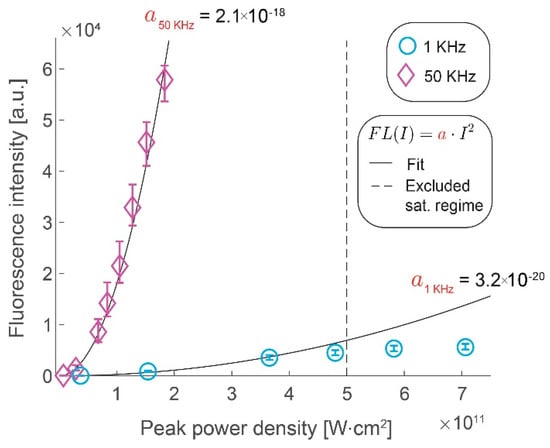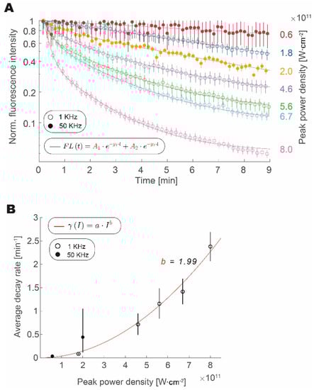 We have measured the fluorescence from fluorescent microspheres over time at different intensities and repetition rates (1 or 50 kHz) to test how photobleaching rate scales with an increase in pulse peak intensity and repetition rate, as shown in Figure 3. We confirmed that the increase in peak intensity expedited the loss of fluorophore fluorescence, regardless of the repetition rate. Data from both 1 kHz and 50 kHz experiments align well with increasing peak pulse intensity. The bleaching traces are well approximated by a double exponential decay []. Amplitude weighted average of the decay follows a power law with a quadratic exponent. This result is similar to reports studying the photobleaching rate in GFP []. Data from the 1 kHz and 50 kHz groups follow this trend, thus indicating that increasing repetition rate has a much lower impact on photobleaching rate than the increase in peak power density. From fits derived in Figure 1 and Figure 2, we can calculate the ratio of average decay rates for the peak power densities that are required to obtain the same fluorescence intensity: