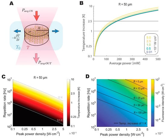 Heating resulting from illumination of biological tissues with high-intensity laser light results in adverse effects, even at levels that are much lower than would be required to induce structural damage. Small increases in temperature induce changes in neural activation patterns and cellular metabolism []. Recently, the modeling of temperature dissipation in two-photon excitation has received considerable attention. Rigorous modeling of the increase in temperature while using Monte Carlo simulations [,], as well as deriving analytical solutions from three-dimensional (3D) Fourier equation using Green’s functions [] has been reported and verified by experiments.