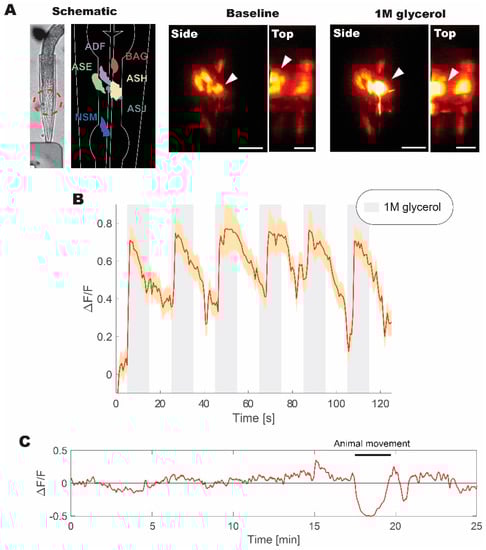 The animal was trapped in a microfluidics device and was repeatedly stimulated with 1M glycerol to induce aversive responses []. In this configuration, we were able to obtain volumetric recordings over the volume of the head (Figure 5). A subset of head neurons expressing fluorescent probe was visible under WF-TeFo excitation when only using a CMOS camera with 60% QE without a photo-multiplication device. This was not possible in our experiments using a 1 kHz source and, as reported by others, using 10 kHz laser setup []. Additionally, we were able to extract fluorescence change (normalized to the baseline) showing reliable responses to the presentation of 1 M glycerol stimulus. The WF-TeFo imaging system in this configuration offers sufficient resolution to see axons, while maintaining a large field of view and without the necessity to use photomultiplier devices. Finally, we tested the applicability of our system for continuous imaging of neural activity. We ascertained that over 25 min. of continuous imaging without stimulation, the baseline fluorescence has essentially remained stable (note that observed dip in the signal in Figure 5C is due to animal motion).
