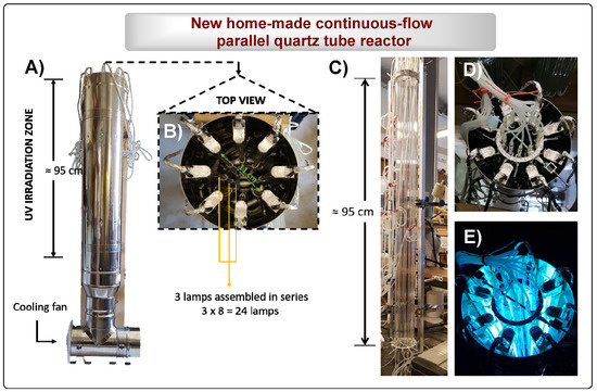 New home-made UV reactor and continuous-flow parallel quartz tube reactor. (A) Overview of the new home-made UV reactor; (B) UV reactor top-view; (C) 12 assembled parallel quartz tubes reactor (PQT6); (D) Reactors top-view; (E) Top-view of the reactors under photochemical irradiation.