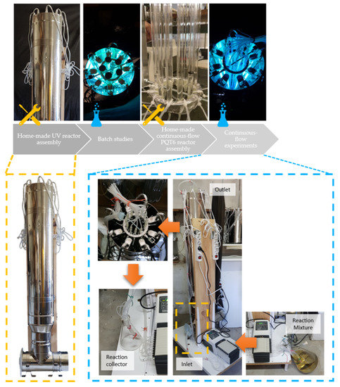 To overcome these limitations, herein is presented the development of a home-made UV reactor and a PQT reactor capable of operating under continuous-flow. The reactors were designed for higher scale production of 2a via photochemical irradiation of 1a (Scheme 2 and Figure 2).