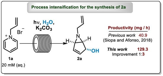 Bicyclic aziridines (α-hydroxycyclopenteno-aziridines) prepared by photochemical transformation of pyridinium salts are key intermediates used for the total synthesis of several aminocyclopentitols (Scheme 1) [1,2,3,4]. In 2016, Bennet and co-workers, described the synthesis of sialic acid derivatives using this synthetic methodology. Under batch conditions, 1-allylpyridinium chloride was irradiated during 16 h to afford 630 mg (60% yield) of 6-allyl-6-azabicyclo[3.1.0]hex-3-en-2-ol (2a), with a productivity of 39.4 mg h−1 [5].
