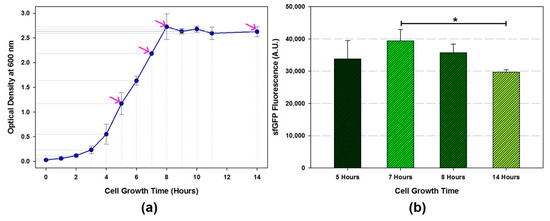 Cell extract performance upon the different cell harvest time. (a) The E. coli K12 MG1655 ΔprfA ΔendA Δrne growth curve. The cell collected at 5, 7, 8, 14 h from the beginning of cell culture. The pink arrows indicate each harvest time. (b) The intensity of the cell-free synthesized sfGFP fluorescence from each cell extract (1750 Joules of sonication energy input, 1000 µL of processing volume, and 60 min of runoff reaction time). Data are presented as the average ± standard deviation (n = 3); * p < 0.05 according to one-way analysis of variance (ANOVA).