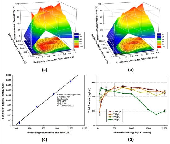 The effect of total energy input and cell suspension volume on the protein productivity of cell extract. (a) The relative protein productivity per each volume. The productivity was represented from 0 to 100% at each processing volume (250, 500, 750, and 1000 µL) by different energy input (from 50 J to 2000 J) to find the optimal sonication energy input for each processing volume. (b) The relative protein productivity with all processing volume (250 to 1000 µL, combined) was represented from 0 to 100% by different energy input (from 50 J to 2000 J) to find the optimal sonication energy and volume for the highest protein productivity. (c) A simple linear regression model of processing volume and sonication energy input. The sonication energy input resulting in the highly active cell extract was selected for each processing volume (250, 500, 750, and 1000 µL) and plotted in a regression model. From the regression model, the optimal energy for each processing volume can be calculated as follows: (Sonication energy input (Joules)) = (The designed processing volume for sonication (µL) + 400) 2.18−1. (d) The changes in the total protein amount of the cell extract in different sonication energy input. Data are presented as the average ± standard deviation (n = 2).