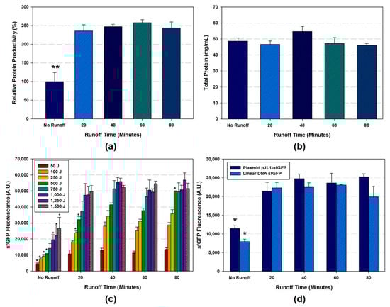 The different runoff reaction was conducted after lysis and centrifugation. The CFPS reaction was carried out for 20 h at 30 °C with pJL1-sfGFP and PCR amplified linear sfGFP template. The data on protein productivity by different runoff time in Figure 4a,b shows that the runoff reaction time is essential for the cell extract from E. coli K12 MG1655 ΔprfA ΔendA Δrne. Protein production performance is comparable to the results in 40–80 min of runoff incubation time reported previously [21,22]. The statistical data using the one-way ANOVA indicates that there were significant differences (p < 0.001) between the cell extract with and without runoff reactions. However, there were no significant differences between cell extract within the 20–80 runoff reaction times. In addition, we observed that total protein contents were preserved during runoff reaction (Figure 4b). Next, we studied the effect of runoff reaction on all different sonication condition (50–1500 Joules, 1000 µL volume processing). The overall result is well correlated to our previous findings (Figure 4c and Supplementary Figure S3a–d). Regardless of sonication optimization, the significant increase of protein productivity was detected after runoff reaction (p < 0.001). Lastly, the effect of runoff reaction time using different DNA template was investigated. We carried out the CFPS reaction for 4 h for both PCR amplified linear template and plasmid instead of applying CFPS reaction for 20 h due to the instability of linear template. In both groups, the cell extract which was prepared without runoff reaction showed significantly low productivity (* p < 0.05) compared to the extract with runoff reaction (Figure 4d). Interestingly, there was no significant difference between the extracts with 20–80 min runoff reaction for the model genomically engineered E. coli strain.
