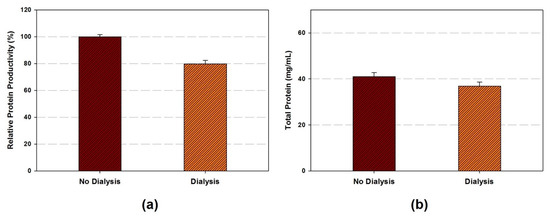 (a) The relative protein productivity, (b) total protein (mg/mL) of cell extract in the condition of dialysis. Data are presented as the average ± standard deviation (n = 2).