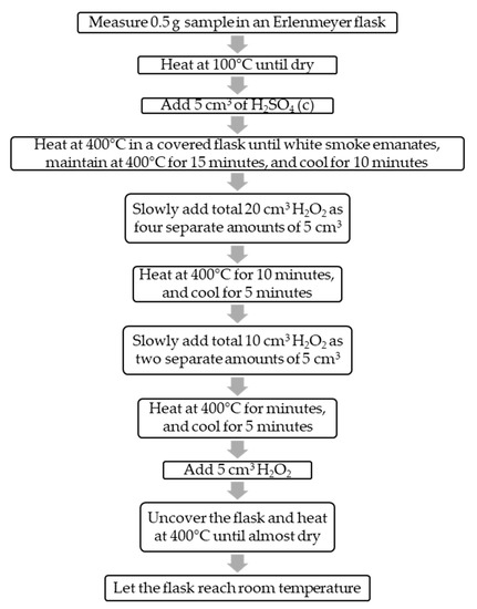The paint decomposition process was done according to the procedure shown in Figure 1 using a heating plate (OVAN, model MMH90E), sulfuric acid (Pharmco-Aaper, analytical grade CAS# 7664-93-9), and 30% hydrogen peroxide (Fisher Chemical, analytical grade CAS# 7722-84-1).