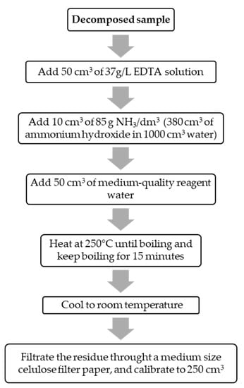 The Pb extraction process from paints was done according to the procedure shown in Figure 2 using disodium salt of EDTA (Lobachemie, analytical grade, CAS# 6381-92-6), an ammonium hydroxide solution (Merck Trademark 25%, analytical grade, CAS# 1336-21-6), and medium-quality reagent water.