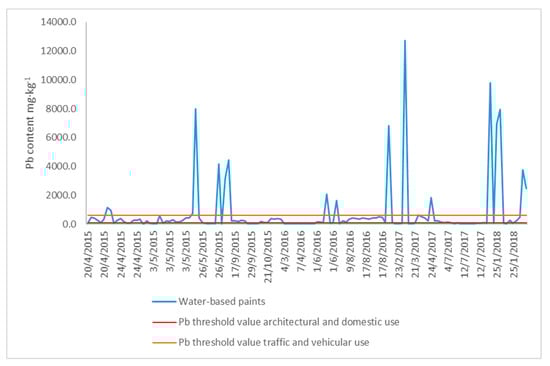 The sample results demonstrated not only the varied Pb content among and within the different types of paints but also that, in some cases, the Pb concentrations were above the threshold values stipulated in the Ecuadorian regulations. In the case of synthetic enamels (average 5578.5 mg·kg−1), solvent-based paints (average 1316.7 mg·kg−1), and epoxy paints (average 167.8 mg·kg−1), the Pb content exceeded the threshold values by 20 and 50 times for paints for traffic and architectural use, respectively.