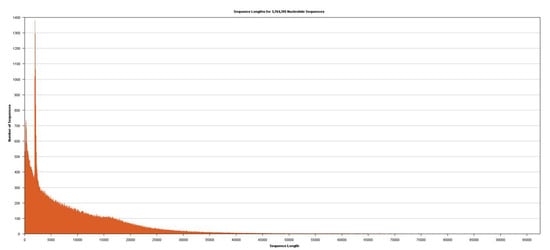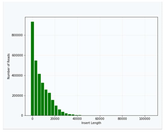 Approximately 40 μg of genomic DNA extracted from sample B1 was used for library production and sequencing. The mean insert length of the library was 8731, with insert N50 = 14,750 (Figure 2). Sequencing was performed using Sequel v2.1 chemistry, obtaining a total of 3,764,395 subreads from 30.0 Gb, with an average length of 7970 (Figure 3).
