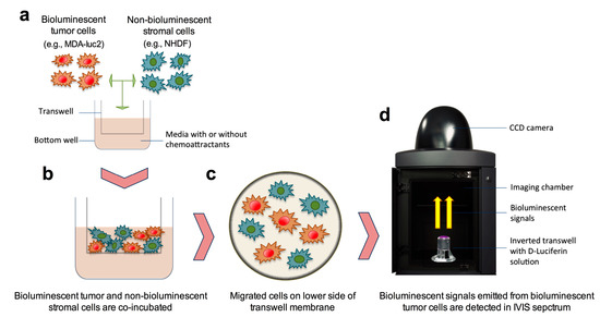 Schematic illustration of the co-incubation of bioluminescent tumor cells and non-bioluminescent stromal cells in the bioluminescence migration assay. (a) Bioluminescent tumor cells and non-bioluminescent stromal cells were seeded and (b) incubated together in transwells. (c) Both bioluminescent tumor and non-bioluminescent stromal cells are likely to have migrated through the membrane. (d) Following removal of the nonmigrated cells from the upper side of the membrane, the bioluminescent signal from the migrated bioluminescent tumor cells on the lower side of the membrane are detected by the IVIS® Spectrum, an in-vivo imaging system, after the addition of D-luciferin solution.