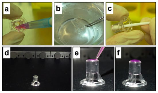 Figure 2. The processing steps of the bioluminescence migration assay. (a) Removal of nonmigrated cells and medium from the interior of the transwell. (b) Washing transwell in phosphate buffered saline (PBS). (c) Removal of nonmigrated cells and residual moisture from the interior of the transwell using a cotton swab. (d) Transwells are placed in the imaging chamber of the IVIS® Spectrum in an inverted position and (e) 40 μL of D-luciferin solution gently pipetted onto the exterior membrane surface. (f) Transwell is ready for bioluminescence imaging. - Wash the transwell twice in PBS (Figure 2b).
