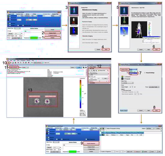 Figure 3. Flowchart of software procedure containing screen shots of key steps. Equipment setup is in no. 1–8 with red rectangles. Measurement and data analysis are in no. 9–12 with red rectangles. No. 13 is an example of bioluminescent signal from transwells.