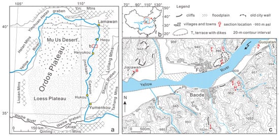 (a,b) Map showing the Yellow River course along the margins of the Ordos Plateau and location of the study area (Baode); (c) topographic map showing the localities of the sections (A–I) shown in Figure 2. The topographic map with contour intervals of 20 m was constructed based on a Chinese 1:50,000 topographic map (unpublished).