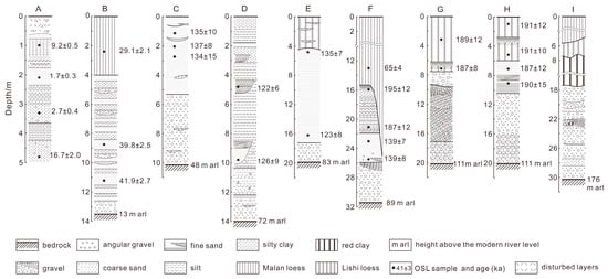Stratigraphic columns of the terrace deposits in outcrops (A–I) marked in Figure 1c, and the positions of optically stimulated luminescence (OSL) samples and ages in ka. The elevations of bedrock surfaces (strath surface) above the modern river are displayed.