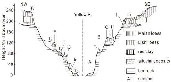 A total of nine exposures of fluvial sediments in the study area were found and observed. Their locations (numbered A to I) are marked in Figure 1c, and their detailed lithology are shown in Figure 2. It can be seen that the sections (exposures) are mainly composed of fluvial sediments called terrace deposits and overlying eolian sediments. The fluvial sediments consist of channel gravels and sands capping the strath surfaces and overbank silt or silty clay overlying the channel deposits. The top eolian layers composed of loess, paleosol or red clay were deposited after paleo-floodplains were completely abandoned. The bedrock surfaces (strath) of Sections B–I were presented, and their elevations range from about 13 m to 176 m above the modern river level (arl) (Figure 2). Based on the elevation of the straths, Exposures B–I are considered to represent seven terraces, from the lowest T1 terrace with the elevation of about 13 m arl and the highest T7 terrace with the elevation of 176 m arl. Accordingly, a schematic composite across-section of the terraces was generated based on the elevations of the terraces and their spatial distribution and is shown in Figure 3. Note that T0 (Section A) is referred to the high floodplain of the river. Exposures (Sections) G and H have the same elevation of strath (111 m arl) and belong to the T6 terrace. It is noted that the effect of the variations in river gradients on terrace height in the study area is negligible.