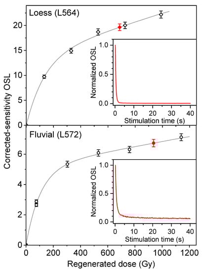 Dose response curves for fine quartz grains from loess sample (L564) and coarse quartz grains from fluvial sand sample (L572). The two curves are fitted by the functions of y = 13.8(1−exp(−(x + 0.139)/136) + 0.00869x and y = 3.17(1−exp(−x/83.3)) + 4.4(1−exp(−x/406)) + 0.0406, respectively. The filled diamonds and circles represent the corrected sensitivity natural signals. The insets show the decay curves for the natural signals from the two quartz samples. Note that the signals were normalized to unity at the first point.