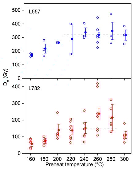 Dependence of De on preheat temperatures for samples L557 and L782. The open circles and diamonds represent the values of individual aliquots, and the filled circles and diamonds represent the average with their associated errors (one standard error).