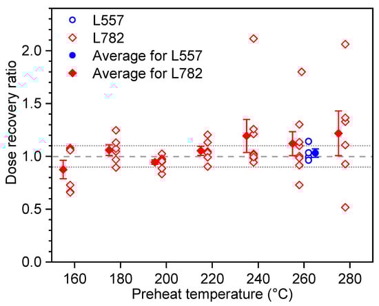 Plot of dose recovery ratios as a function of preheat temperatures for sample L557 and L782. The dose recovery ratios were obtained by dividing the recovery De values by the given doses (see text for details). The open circles and diamonds represent the values of individual aliquots, and the filled circles and diamonds represent the average with their associated errors (one standard error).