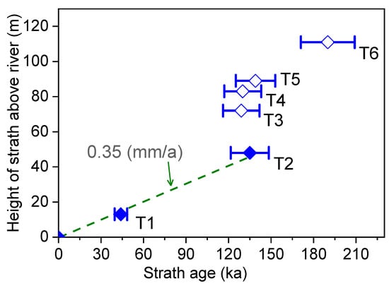 As discussed above, the luminescence properties of the samples and stratigraphic consistency of the OSL ages obtained for the terraces appear that the OSL ages are reliable. In order to further evaluate the reliability of the ages, the strath ages obtained for the terraces and strath elevations above the modern river level are plotted in Figure 8. It is known that higher strath terraces are generally formed earlier than lower terraces for a river, implying that the OSL ages of samples from higher terraces should be older than the ages of lower terraces. From Figure 8, it can be seen that the formation ages of the straths for the T2, T3, T4 and T5 terraces are very similar, but their elevations increase from 48 m arl for the T2 terrace to 89 m arl for the T5 terrace. The only reasonable explanation for this situation is that the OSL ages of the fluvial samples from the T3 to T6 terraces were underestimated or regarded as the minimum ages of these terraces.