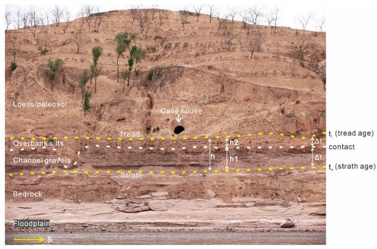 Fluvial terraces are morphostratigraphic units, and terrace deposits are channel sand and/or gravel facies overlain by fine overbank facies deposits bound by bottom strath and upper tread. Loess/paleosol deposits accumulate on the tread in our studied area (Figure 9). Fluvial terraces are geomorphologically classified into strath terraces and fill terraces, and the only difference between them is that there is only a thin layer of fluvial sands or gravels atop bedrock strath surfaces for strath terraces [80]. Practically, different thicknesses (h1 in Figure 9) of the “thin layer” have been used when a terrace is assigned as a strath terrace in the field. The thickness varies from about <3 m [4,77,81,82,83] or <10 m [2,84] or >10 m [85,86,87]. Pazzaglia and Brandon [77] proposed the criterion of the thickness of <3 m of coarse fluvial sediments for strath terraces and considered that this thickness represents the sediments in transport in a channel and the approximate scour depth during bankfull or larger discharges in a river the size of their studied river. This implies that the river downcutting and deposition of channel gravels for a strath terrace are simultaneous, and the thickness of channel gravels for strath terraces is associated with river size.