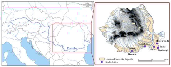 Showing the location of the loess and loess-like deposits in Romania alongside the previously investigated sites—Mircea Vodă, Tuzla, Costinești, Urluia, Mostiștea and Lunca.