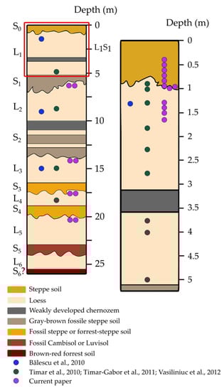 Stratigraphic column of the Mircea Vodă loess-paleosol section (drawn by the authors based on field observation and in accordance with previous stratigraphy presented by a Bălescuet al. [38]). The column on the right represents the first approximately 5 m at a higher resolution. The colored circles represent the position of the samples which were investigated in previous studies and current paper.