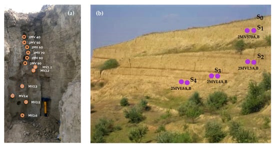 For the current paper, investigations were performed on 20 new samples from Mircea Vodă section. The first 12 samples (2MV 40–MV 2.6) were taken from the Pleistocene/Holocene transition (Figure 3a), while doublet samples (2MV 570, L3, L4 and L5) were taken directly beneath the S1–S4 units, respectively (Figure 3b). The sampling procedure was carried out by using stainless steel tubes inserted horizontally in the freshly cleaned profile.