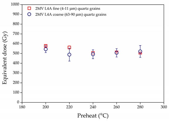 Equivalent dose dependence on preheat temperature for sample 2MV L4A for fine (4–11 µm) quartz fraction (open red squares) and coarse (63–90 µm) quartz fraction (open blue circles).