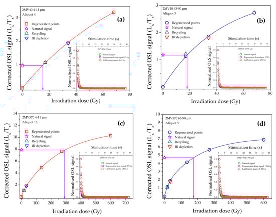 For both quartz fractions, the average sensitivity-corrected natural signals (Lnat/Tnat) for the 2MV570, 2MV3, 2MVL4 and 2MVL5 samples were plotted as a function of the expected De (Figure 6). Bearing in mind the fact that these samples were taken directly under the paleosol units, the expected ages were found based on the climatic records of benthic δ18O [50]. The expected De was thus calculated by multiplying these ages with the annual dose values obtained in Table 2. A relative uncertainty of 10% was considered. It can be noted that the samples are in field saturation, meaning that the natural signals are no longer increasing with depth. The averaged natural signal for fine quartz is 59% of the average sensitivity corrected signal for the 5000 Gy regenerative dose (a dose high enough for the laboratory dose response to approach saturation—see Figure 7) and the coarse quartz natural signal is 75% of the average sensitivity corrected signal for the 2000 Gy regenerative dose (a dose high enough for the laboratory dose response to approach saturation—see Figure 7). These ratios of the natural signals to laboratory saturation levels for the two grain sizes are in agreement with previous reports from Timar-Gabor et al. [9] for an infinitely old sample. Differences of 60% (4–11 µm quartz) and 80% (63–90 µm quartz) were reported between the natural and laboratory dose response curves constructed for the nearby loess-paleosol site of Costinești [28]. Similar discrepancies between the natural and the laboratory dose response curves were reported by Chapot et al. [30] on samples taken from Luochuan, China.