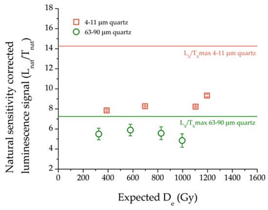 The natural sensitivity corrected luminescence signal (Lx/Tx) for samples 2MV570, 2MV3, 2MVL4 and 2MVL5 for 4–11 µm quartz (open squares) and 63–90 µm quartz (open circles) plotted against the expected De. The average maximum sensitivity corrected signal (Lx/Tx max) for a regenerative dose of 2000 Gy in the case of coarse grains and 5000 Gy in the case of fine grains (taken from the data presented in Figure 7) is shown as a reference for both quartz fractions.