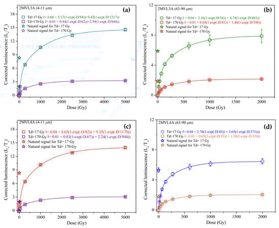 Comparison of growth curves for samples 2MVL3A (a,b) and 2MVL4A (c,d) for both quartz fractions. The curves were best described by a sum of two exponential exponentials function. At least three aliquots have been used in order to obtain the average corrected luminescence signals used to construct de growth curves. A preheat temperature of 220 °C for 10 s and a cutheat of 180 °C have been employed.
