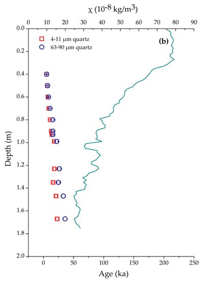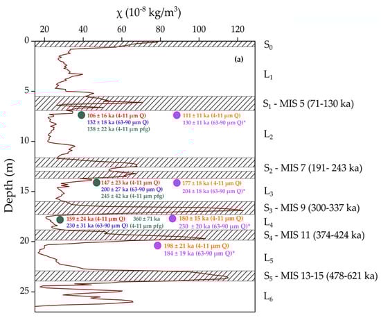 (a) Schematic representation of the loess (L) and paleosol units (S; hatched area) with magnetic susceptibility values (χ) from [2].The boundaries of paleosols developed during odd marine isotope stages (MIS) are after [49]. The ages for the old samples (green circles) and new samples (purple circles) are shown as follows: written in red—[2]; blue—[8]; green—[14] and written in orange—4–11 μm quartz current paper; purple—63–90 µm quartz current paper. The current ages represent the weighted results from the doublet samples. The optical ages marked with asterisk (*) were obtained for samples which were found to be close to saturation levels. (b) Plot of new optical ages as a function of depth alongside new magnetic susceptibility data. The fine (4–11 µm) quartz ages are represented as open squares and the coarse (63–90 µm) quartz ages are represented as open circles.