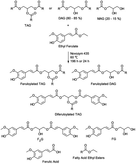 Schematic of the transesterification of vegetable oil TAG or vegetable oil mixture of DAG and MAG with ethyl ferulate, R = vegetable oil fatty acid (e.g., 18:0, 18:1, 18:2, 16:0). Major products: feruloylated triacylglycerol (TAG), feruloylated diacylglycerol (DAG), and diferuloylated TAG. Minor products: feruloylated glycerol (FG), diferuloylated glycerol (F2G), and ferulic acid. The product mixture also contains unreacted ethyl ferulate, unreacted vegetable oil, and vegetable oil fatty acid ethyl esters.