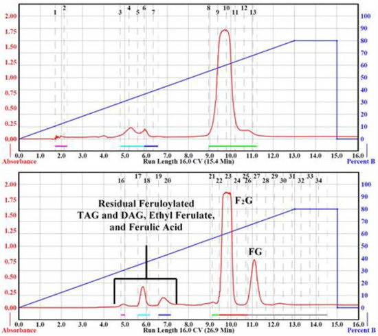 Overall, combining the F2G and FG isolated from all flash chromatography runs, F2G and FG were isolated in a mass yields of 39.1 and 9.4 g, respectively (48.5 g total), from the 96.4 g of raw precipitate filtered from the feruloylated Enova Oil. Previously described separation methods (e.g., preparative HPLC, high-speed counter-current chromatography) to isolate F2G, FG, and similar phenylpropenoid glycerols as natural products from plant sources could only accommodate ~0.1–0.2 g of material [5] or the method had to be repeated over 40 times to purify 2–4 g of F2G or FG [26]. FG has been synthesized de novo and via the lipase catalyzed esterification of glycerol with ethyl ferulate or ferulic acid, but only in mg quantities identifiable by analytical HPLC [14,20] or purified by conventional column chromatography without yields reported [29]. The synthesis and isolation of F2G was previously reported in ~10 g yield as a precipitate collected from a similar lipase-catalyzed transesterification of ethyl ferulate with deacylated soybean oil; however, the purification was reported as a diethyl ether wash of the raw precipitate collected without FG being identified as a component [24]. Since both F2G and FG are sparingly soluble in diethyl ether, it is presumed that the FG was lost in the diethyl ether washes. Comparatively, the flash chromatography method reported herein can purify up to 2.0–3.0 g of F2G and FG per run in about an hour and was a necessary improvement over previously reported methods to be able to process ~95 g of raw material containing a mixture of F2G and FG in a timely and convenient manner.
