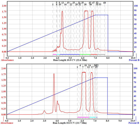 Table 2, Run 1 details the parameters and conditions of the purification of 100 mg sample using the manufacturer’s suggested column specifications (Table 1). The Sample and Load Columns were conditioned with 3 CV of hexane before the binary gradient was applied. The flash chromatography results of Run 1 are depicted in Figure 2. Separation of F2G and FG was not obtained using the specified flow rate of 35 mL/min. Several attempts were made to adjust the binary gradient slope and run length using the manufacturer’s suggested flow rate for the 24 g column without success. When the flow rate was arbitrarily reduced by ~1/3 to 20 mL/min using identical parameters separation of F2G and FG was obtained. The contents of the collected aliquots were confirmed by HPLC vs. standards (e.g., feruloylated soybean oil, ethyl ferulate, ferulic acid) and F2G (calculated exact mass 444.1 u) and FG (calculated exact mass 268.1 u) were further confirmed by LC–ESI–MS as the sodium adduct [M − H + Na], major ion 465.0 m/z, and the major ion 266.9 [M − H]−, respectively, and by 1H NMR (Figure S2), confirming previously published results [5,14,20,26]. Table 2, Run 2 was repeated three times and afforded a F2G yield of 38 ± 0.025% and a FG yield of 9.4 ± 0.003% (47.4 ± 2.4% total), relative to the initial 100 mg of raw precipitate. This was almost exactly a 4:1 F2G:FG ratio isolated from the raw precipitate.