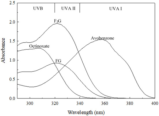 UV absorption spectra of F2G and FG in comparison to the commercial UV-absorbing ingredients Octinoxate and Avobenzone (50 μM solutions in acetonitrile). UVB, UVA II, and UVA I are defined by the U.S. Food and Drug Administration and the European Union Commission.
