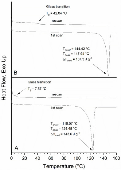 Differential scanning colorimetry of pure: (A) FG and (B) F2G.