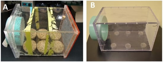 The egg-laying cage measuring 300 mm × 200 mm × 200 mm. (A) An egg-laying cage holding ~10,000 flies, which contains six plates of cornmeal-sucrose-yeast medium. (B) An empty egg-laying cage showing the six small (35 mm × 10 mm) plastic Petri dish bottom halves taped upside-down onto the bottom of the cage using double-sided tape.