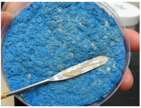The yeast paste is evenly applied with a flat spatula over the sponge surface.